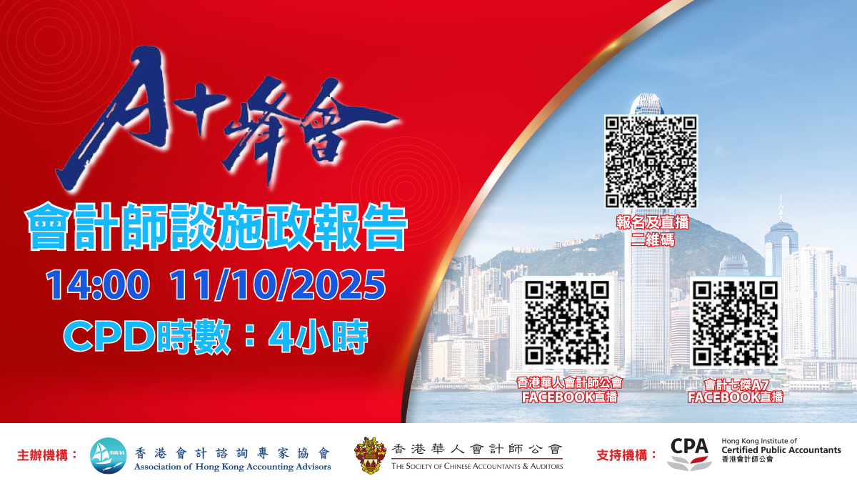 This is a friendly reminder to participate in the “A+峰會: 會計師談施政報告” (the Summit), organized by the Society of Chinese Accountants and Auditors (SCAA) and the Association of Hong Kong Accounting Advisors (AHKAA). Please note the important update on how to register for the event below.